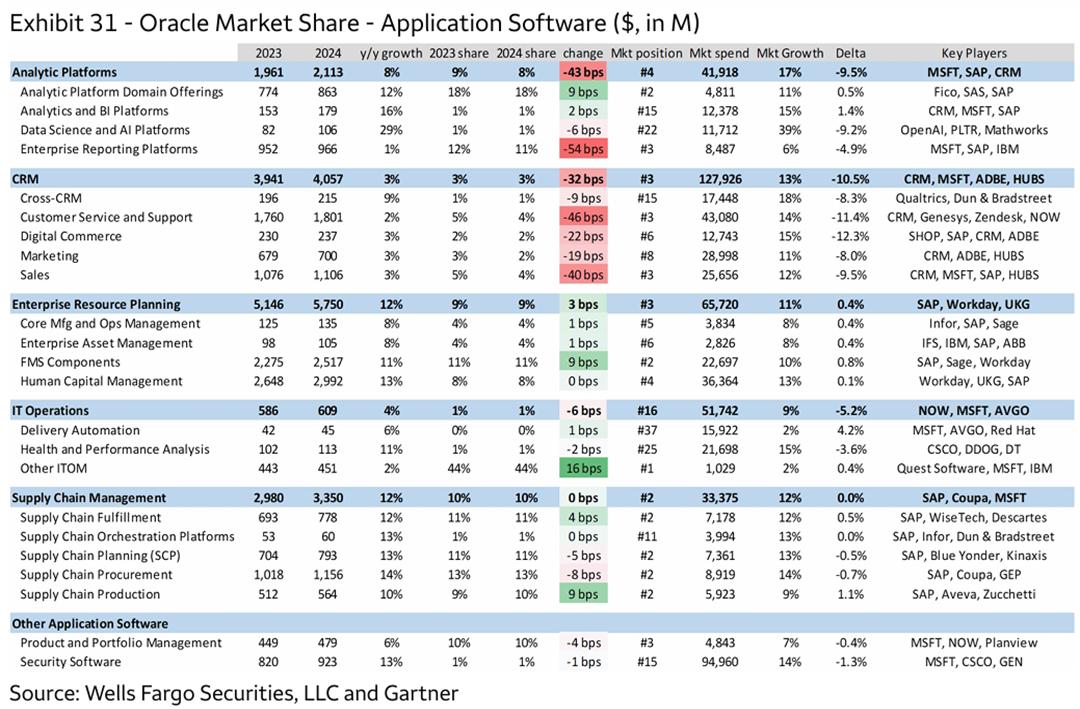 交叉比对行业数据,Oracle在软件应用板块内的后台管理系统上确实处于行业头部地位--市占率普遍处于Top3之内。由下表可见,在CRM、ERP和 SCM这三个主要模块上,Oracle的市占率都是第二或第三,仅次于SAP和Salesforce两最大龙头。而类似于Analytic 和 IT Operation等模块上Oracle的市占排名就相对靠后,强弱对比明显。