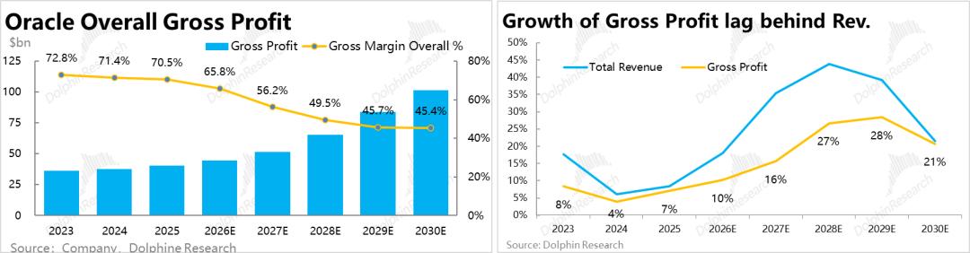 具体预测上,基于Core OCI中非AI部分的毛利率大体稳定在40%出头,而AI部分的毛利率这会在27财年首度转正,并于30财年接近30%毛利率的预期,测算出Oracle整体的毛利率会从25年的70%出头,到30财年下滑到约45%。