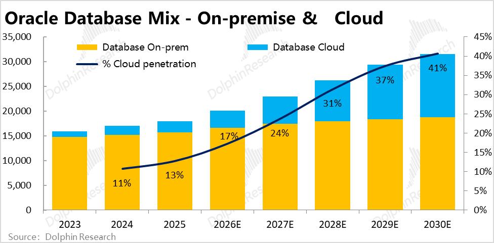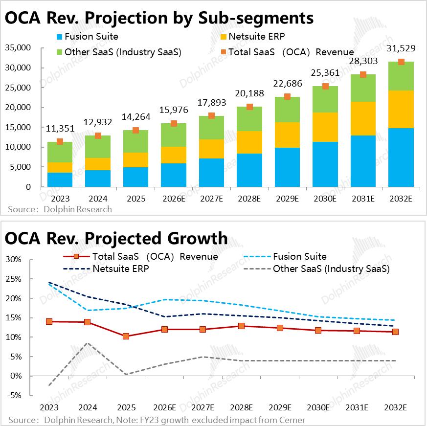 具体预测上,考虑到Fusion和Netsuite EPR业务在过去2~3个财年内的营收增速仍维可达15%~25%,增长势头仍不错,且Oracle确实在后台管理系统上处于行业领先地位,因次海豚君的基础假设是Strategic Back-Office产品线在26~30财年内仍维持约15%~16%的复合增长,带动整个OCA板块营收在同期内平均以12%的速度增长。