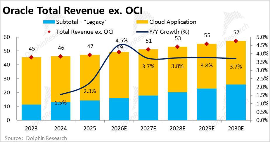 汇总对“Legacy”业务和OCA SaaS业务,则我们对Oracle剔OCI外所有业务的营收预期大约是从26财年的约490亿增长到30年的567亿,复合增速3.6%,比公司官方指引隐含的复合增速低1pct。