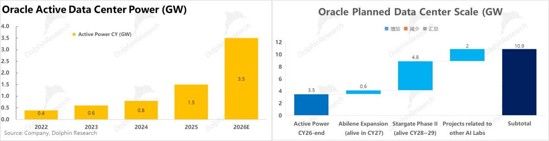 那么目前Oracle已上线或已计划的数据中心算力规模有多少?参考市场内的预测,26自然年底公司已上线算力约为3.5GW。而已计划的26自然年之后上线的算力中心规模大约为7.4GW--包括Alibene项目拓展的0.6GW,Stargate Phase II阶段的约4.8GW,以及和其他AI Lab如xAI、Meta等合作的合计约2GW(这一部分无公开披露验证)。
