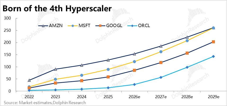b.从动态的视角,参考近期的市场预期,OCI到30财年的营收体量(包含IaaS+数据库+Legacy)将接近谷歌云的总营收体量,并相当于AWS和Azure营收规模的50%~55%,这意味着到30财年Oracle将正式成为第四家云计算Hyperscaler。