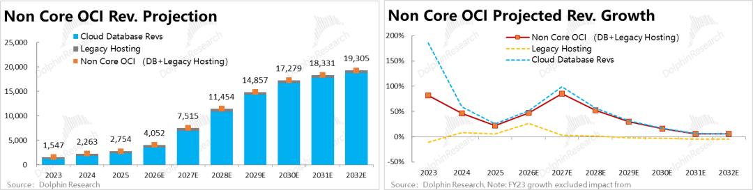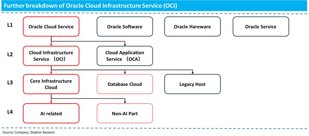 接下来,进一步深入了解并细拆最关键的OCI板块。参考相关研究,OCI可再分为三个细项--遗留的Legacy业务,云数据库(Database)业务,和Core OCI业务--即狭义的IaaS算力租赁业务(对应的我们把Legacy + BD云 归类为非核心Non-Core业务),具体来看: