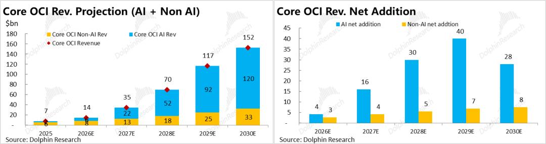 根据公司在F3Q26业绩后最新的OCI板块营收指引,再剔除以上测算非Core OCI部分,隐含Core OCI的营收需要从26财年的$140多亿爆发式增长到30财年的$1500多亿,其中: