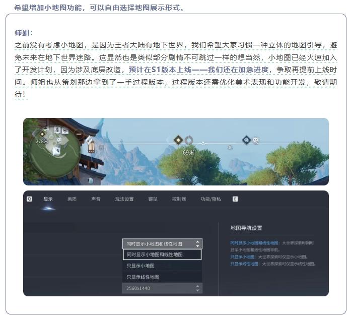 《王者世界》也迅速回应了小地图的问题,表示正在加急研发进度,预计在S1版本中上线,也许会对整体的剧情体验有一定的优化效果。