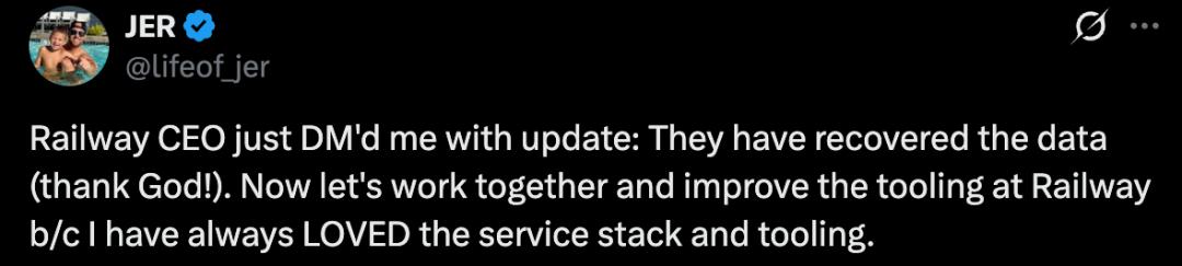不过,Jer Crane 在给 Railway CEO 发送私信后得到回复,目前已经恢复了数据。