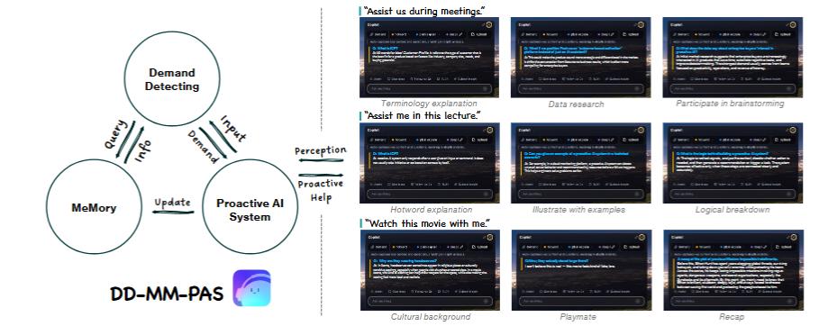 研究人员提出了一个通用范式,将被动模型转换为主动智能,包含三个相互作用的模块:需求检测(DD)、长期记忆(MM) 和主动系统(PAS)。