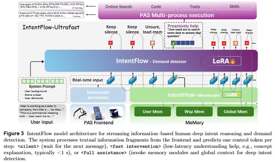 于是,研究人员决定自己探索一套方法,提出了「需求探测—记忆—主动智能体」的范式PASK,包括全新的问题解决范式、IntentFlow流式意图检测模型、自进化式记忆模块和主动智能体工程架构。