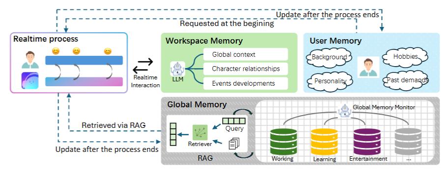- 全局记忆(类似外存):现实中的事件往往是一个系列,全局记忆承担「超级上下文」的角色,跨事件持久保存。