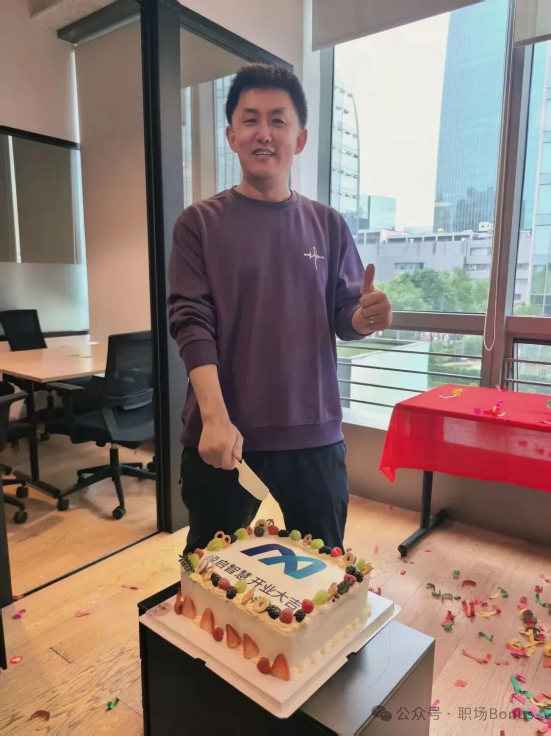 ● 邓江在自己的创业新公司「缘启智慧」开业现场切蛋糕(受访者供图)