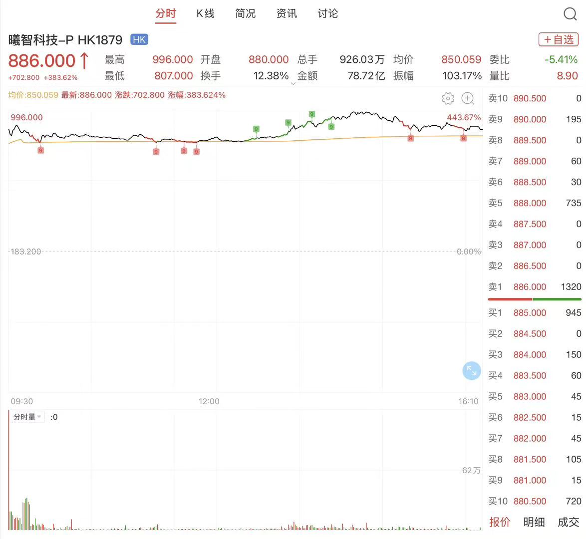 截至4月28日收盘,曦智科技收涨383.62%,报收886港元/股,总市值约815亿港元。