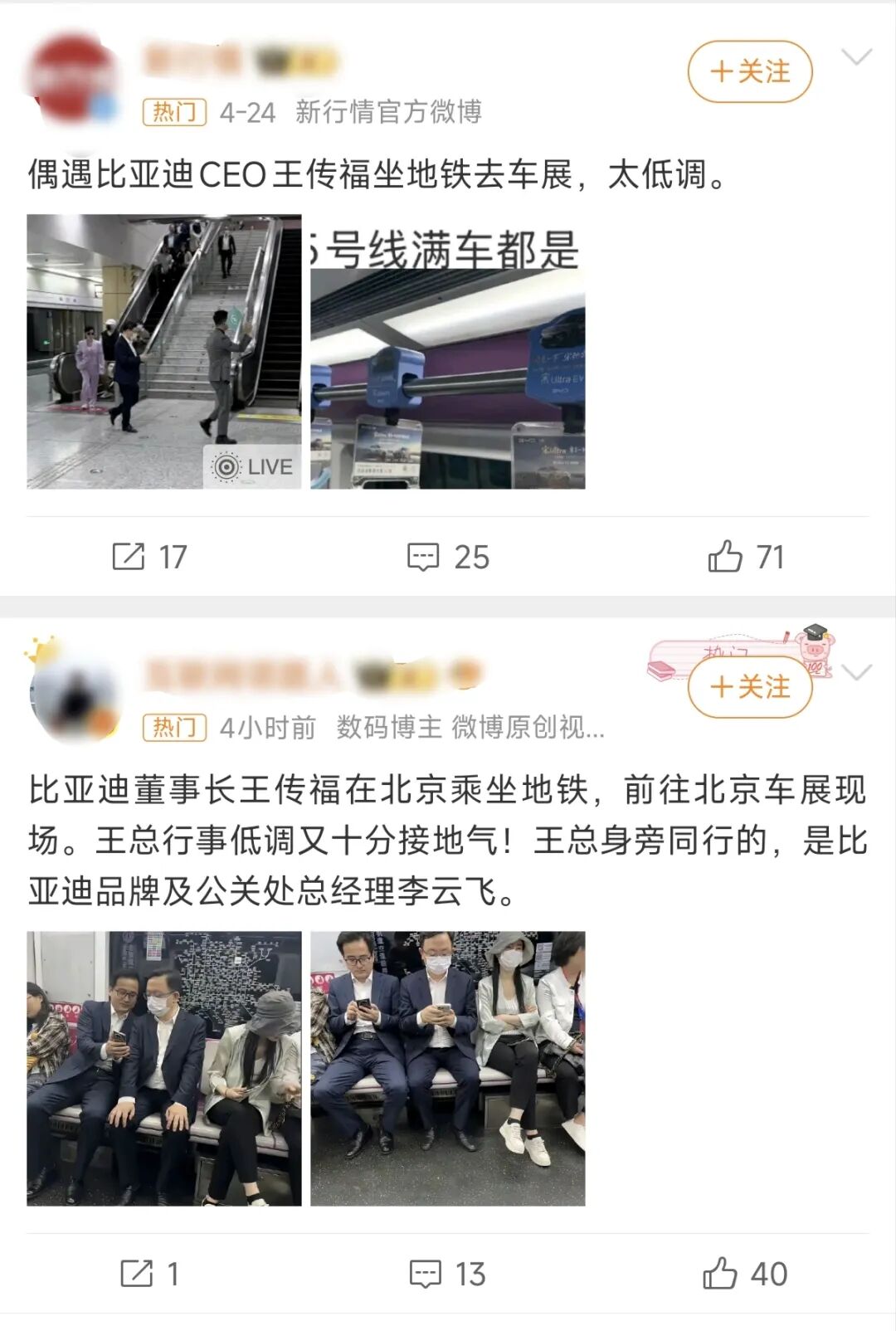 还有王传福,车展期间多次坐地铁赶到展馆,被网友拍下来之后,瞬间刷爆社交媒体。