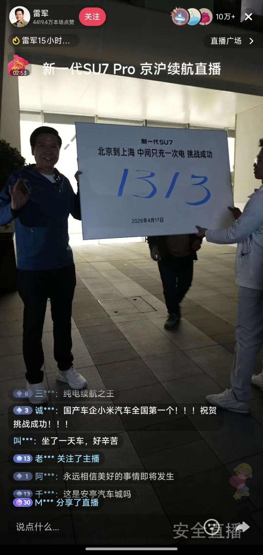 再看上个月,小米新SU7北京到上海的续航挑战,雷军抖音直播间白天稳定8万人同时在线,晚上直接冲到10万+。这是什么概念?