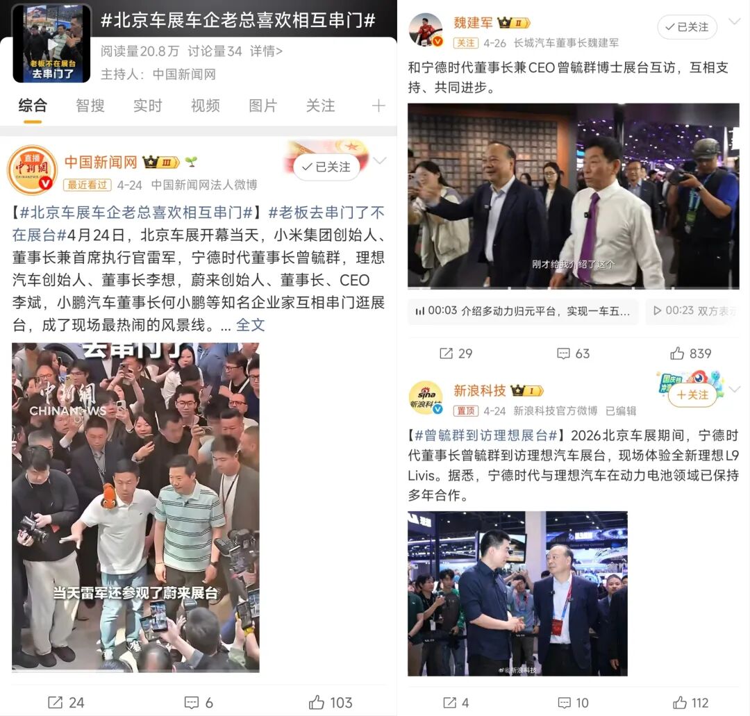 不止雷军揣着一兜定制T恤,把竞争对手的展台逛了个遍;宁德时代董事长曾毓群密集走访多家车企展台;李想跑去看大众;何小鹏去参观蔚来;朱江明看完蔚来,又去看小鹏……
