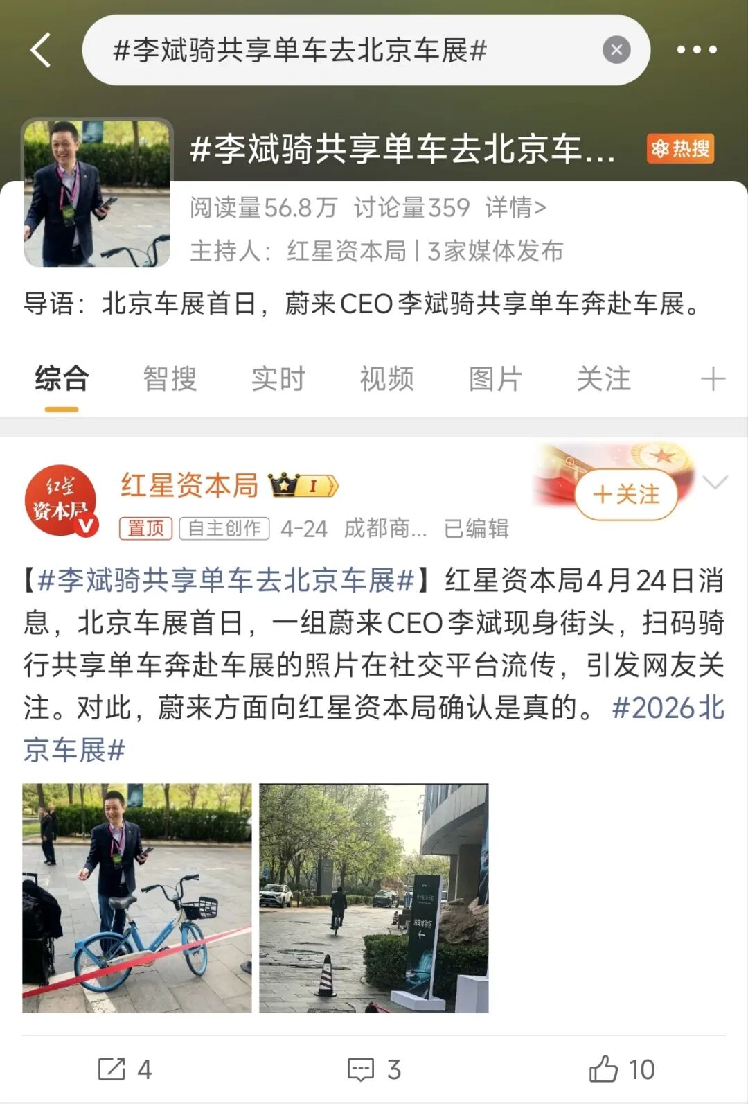 #李斌骑共享单车去车展#为何能火,那是因为用户看到的不是一个车企CEO,而是一个接地气的、不端着的普通人。