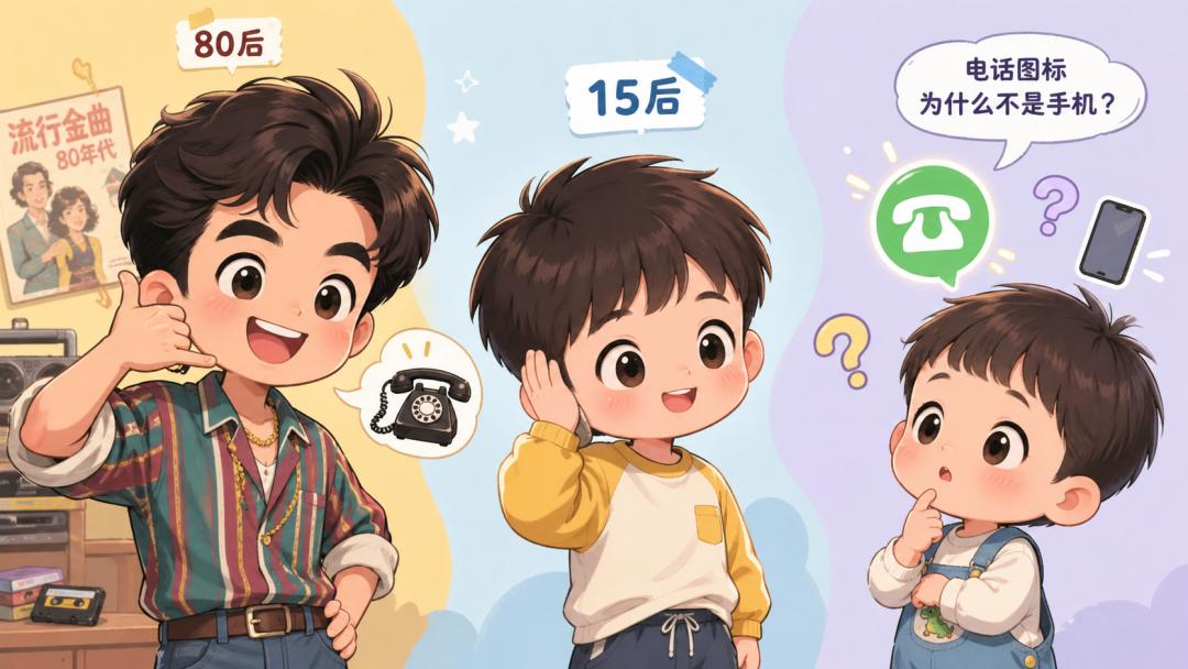 有一个流传已久的段子是,当你让 80 后和 15 后同时做一个「打电话」的手势,你会发现两代人的答案截然不同——有人比出六,有人整个手掌贴在耳边,还有人甚至不理解为什么电话的图标不是智能手机的模样。