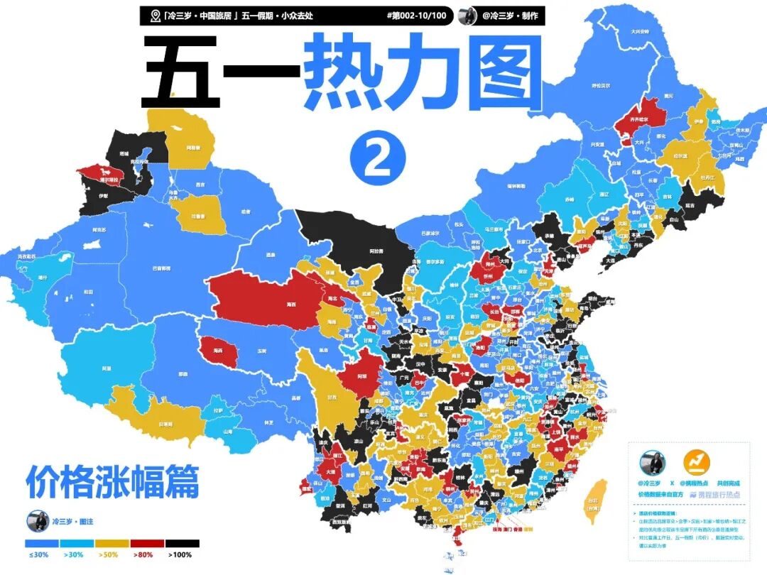 资深旅游博主 @冷三岁 综合OTA平台全国多个城市品牌连锁酒店价格数据制作的热力图显示,全国酒店价格涨幅超过30%的城市超过2/3,价格涨幅超过50%的城市占比超过1/2,价格涨幅超过80%的城市比比皆是。
