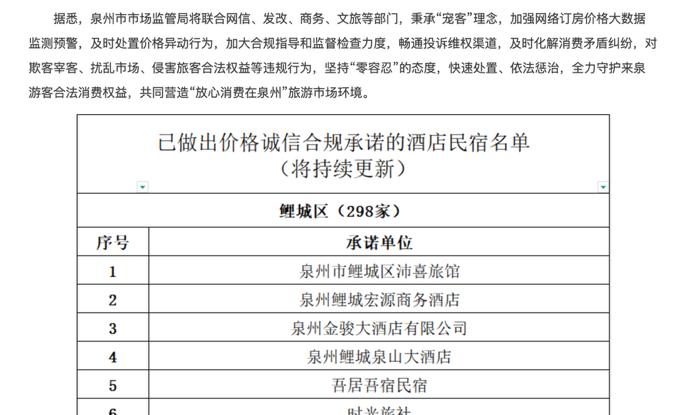 不久前,泉州1496家酒店民宿签署价格诚信合规承诺书,承诺将合理定价、严格明码标价、杜绝“漫天要价”“坐地起价”等价格欺诈或侵犯消费者合法权益行为。