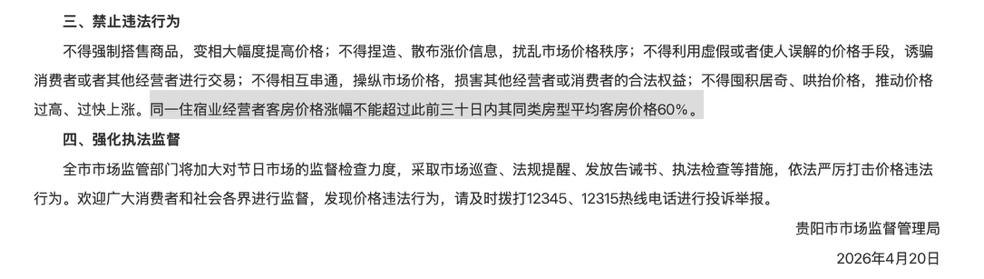 4月21日,《贵阳市市场监督管理局关于2026年“五一”假期期间价格行为的提醒告诫函》就有这么一条: