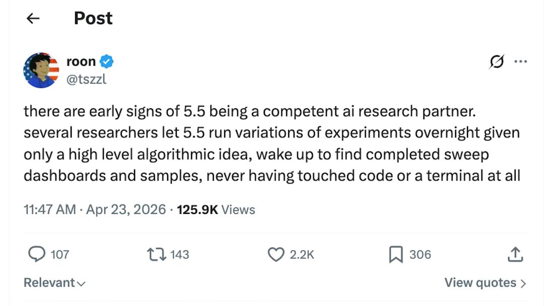 Alex:你早些时候和我一起参加了一个有许多媒体成员参与的电话会议。其中一件有趣的事是你开门见山地说该模型能更直观地理解你的需求,不需要像过去那样一字不差地详细说明。这里有一条来自roon的推文:已有早期迹象表明5.5是一个称职的AI研究伙伴。几位研究人员让5.5在夜间运行各种变体实验,仅需提供高层级的算法构思,醒来后便能看到完整的实验组、仪表板和样本,完全没有接触过代码或终端。关于这一点,这是一个由两部分组成的问题:你们是如何做到的?这是否意味着提示工程已经过时了?