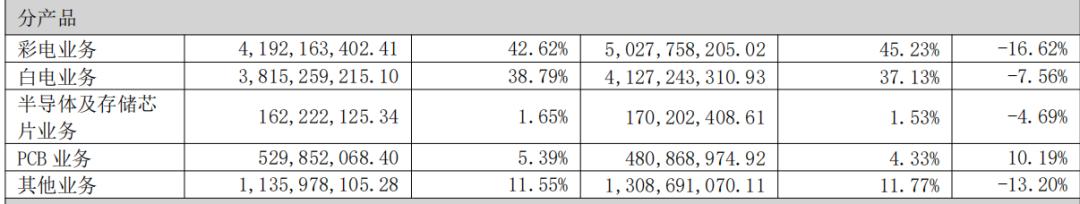 分板块来看,康佳的六个业务中,五个出现收入下滑。其中,收入占比最大的彩电业务2025年收入下降幅度为16.62%,白电收入下降幅度为7.56%,半导体及存储芯片业务收入下降幅度为4.69%,其他业务收入下降幅度为13.20%,只有PCB(印制电路板)业务实现了10.19%的增长。