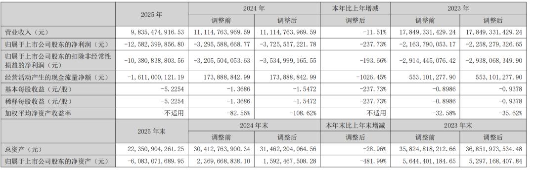 同日,康佳集团发布的财报数据显示,2025年,公司实现营业收入98.35亿元,同比下降11.51%;归母净亏损125.82亿元,亏损额同比扩大。同期,归属于上市公司股东的净资产为-60.83亿元,上一年同期为15.92亿元。