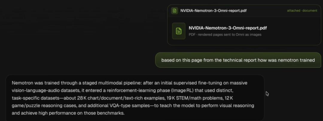 他又将Nemotron 3 Nano Omni的技术文档直接输入模型,要求其解释模型的训练方式。面对从视频到文本的多源信息切换,模型依然能够无缝衔接,在同一推理框架下解析复杂技术细节,梳理出包括混合专家架构、数据与训练流程在内的关键逻辑。