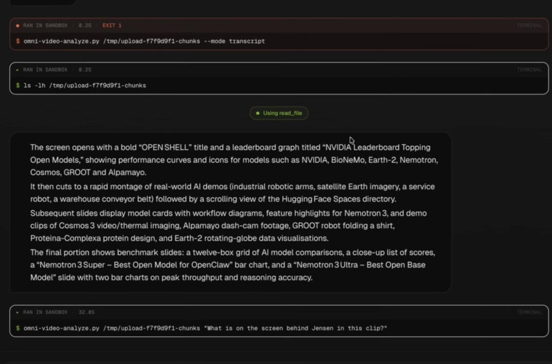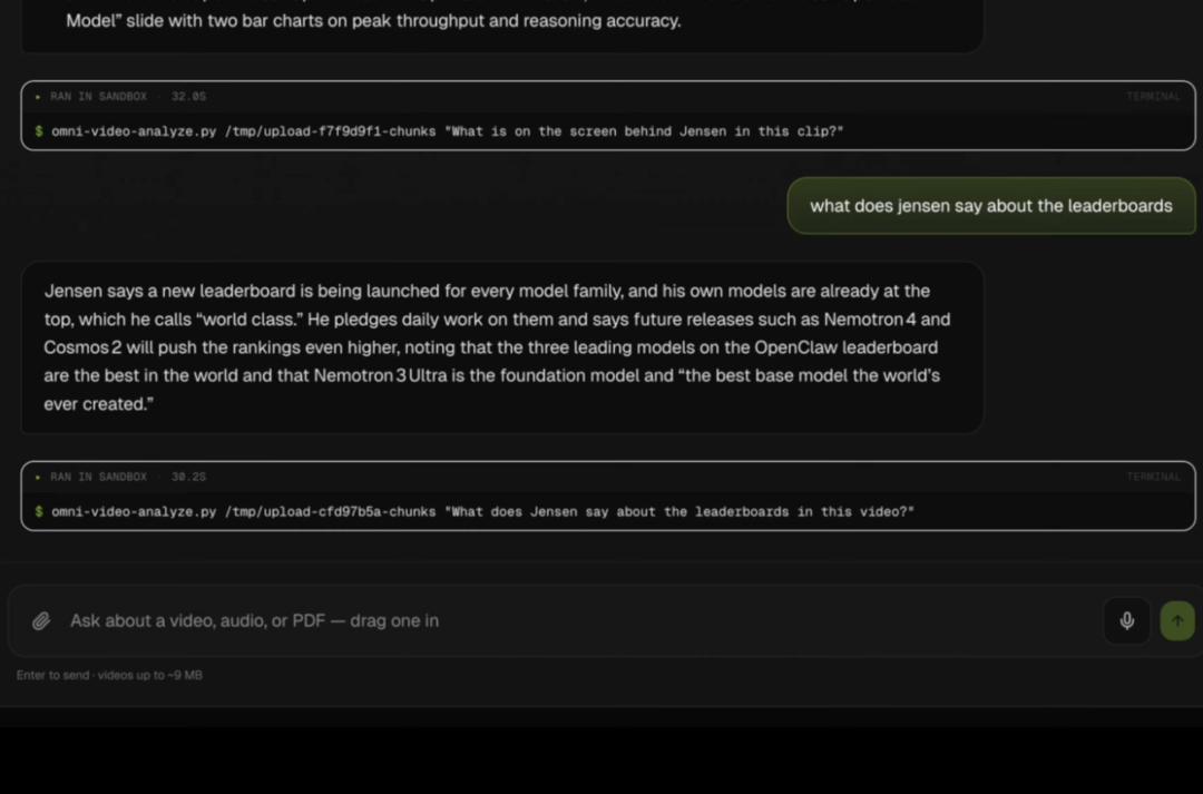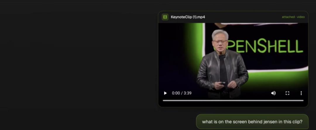 在实际测试中,一位海外博主上传了黄仁勋(Jensen Huang)在NVIDIA GTC 2026上的一段三分多钟的演讲视频,并直接向模型提问视频内容。Nemotron 3 Nano Omni 在短短几秒内,便完成了对画面与语音的联合理解,不仅准确概括了演讲核心观点,还能指出具体语境中的关键信息。