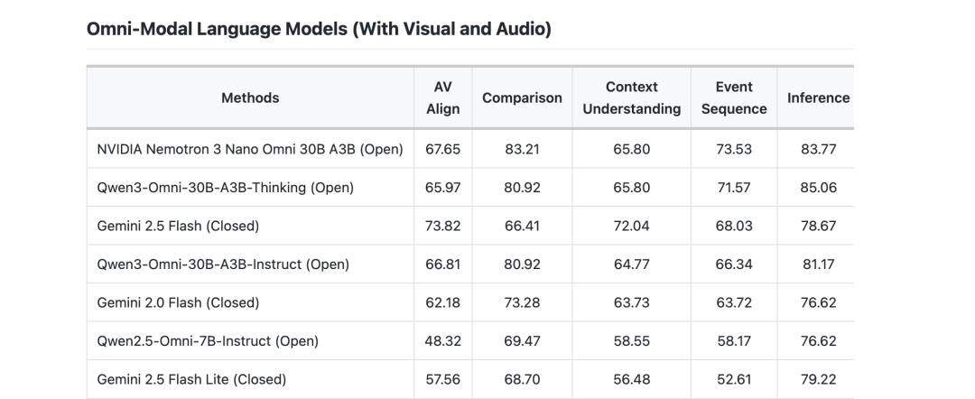 训练数据集方面,Hugging Face显示,Nemotron 3 Nano Omni使用Qwen3-VL-30B-A3B-Instruct、Qwen3.5-122B-A10B、Qwen3.5-397B-A17B、Qwen2.5-VL-72B-Instruct和gpt-oss-120b进行了改进。