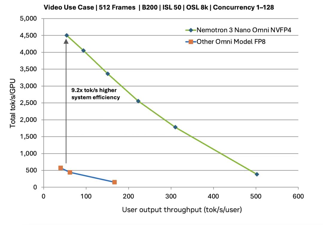 对于相同交互阈值下的视频推理,Nemotron 3 Nano Omni可维持更高的总吞吐量,与替代的开放式全向模型相比,其有效系统容量可提高约9.2倍。