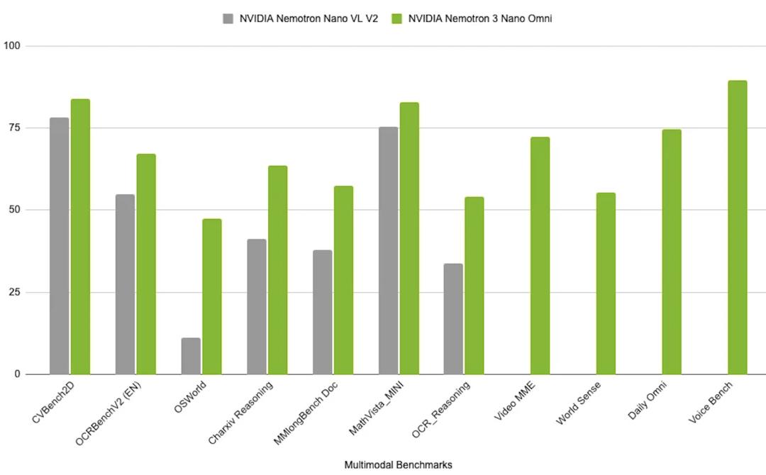 从之前的 Nemotron Nano VL V2型号到 Nemotron 3 Nano Omni,多模态精度在行业领先的基准测试中均有所提高。
