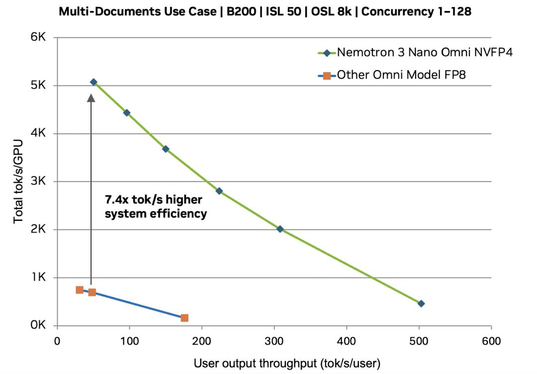 对于相同交互阈值下的多文档推理,Nemotron 3 Nano Omni可维持更高的总吞吐量,与替代的开放式全向模型相比,其有效系统容量可提高约7.4倍。